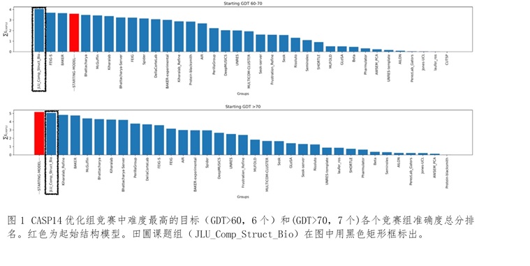 针对蛋白质分子结构优化任务的核心是自由能最小化的本质,田圃团队首次引入计算图和自动微分,发展了局部分布理论的局部最大似然近似实现,并通过坐标变换实现了严格的键长键角刚性约束,得到了端到端动态模拟和自由能计算的人工智能方法(RSC Adv.2021,11:12929)。在CASP14 (https://www.predictioncenter.org/casp14/index.cgi)全球蛋白质结构优化竞赛中,如图1所示,在难度最高(GDT打分大于60)的两组目标中,在获得最高准确度积分的同时展示出比主流方法高出三个数量级以上的效率。打破了主流分子模拟框架在准确度和效率之间选择的困境。