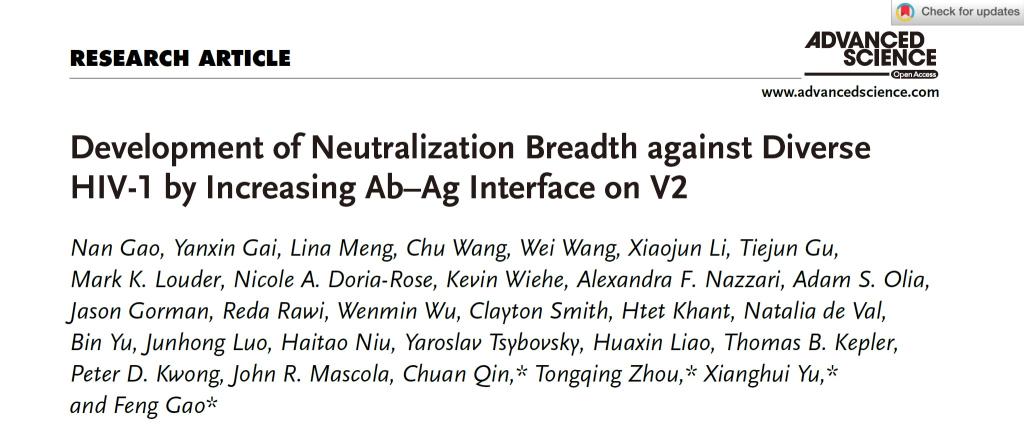 伟德BV1946官网高峰教授、于湘晖教授科研团队针对目前已知报道感染时间最长的恒河猴动物模型作为研究对象,分析其体内诱导产生的广谱中和活性。通过抗体分离获得针对特异表位的J038广谱中和抗体谱系。该工作研究抗体谱系以及体内病毒包膜蛋白的突变情况,追溯广谱中和抗体的进化过程以及与SHIV共同进化的过程,分析非人类灵长动物体内与人体内产生广谱中和抗体的类似性,为更好地应用恒河猴模型来评价HIV-1疫苗提供理论和实验依据。该J038谱系抗体的发育细节和识别特征为今后V2靶向广谱中和抗体的研究和应用提供了新的见解。该研究成果于2022年03月24日在学术期刊《Advanced Science》在线发表(Development of Neutralization Breadth against Diverse HIV-1 by Increasing Ab–Ag Interface on V2)。论文第一完成单位为伟德BV1946官网,第一作者为伟德BV1946官网的博士研究生高楠,伟德BV1946官网于湘晖教授和高峰教授,美国国立卫生研究院疫苗研究中心的周同庆教授和中国医学科公司医学实验动物研究所秦川教授为该论文的共同通讯作者。