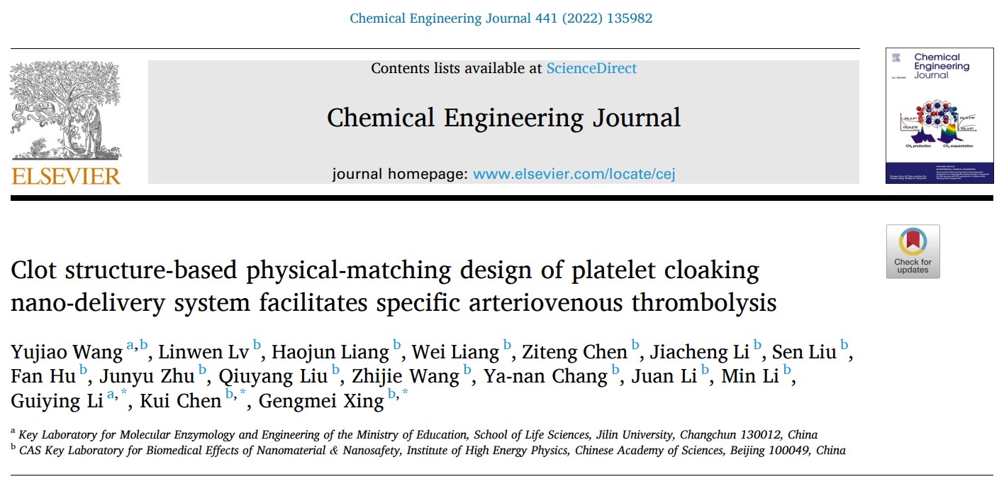 伟德BV1946官网分子酶学工程教育部重点实验室李桂英教授团队与中国科公司高能物理研究所邢更妹研究员团队合作,通过调整血小板膜伪装递送系统的粒径,优化递送系统在动静脉血栓中的渗透性和滞留性,构建出物理匹配型血栓递送系统,实现了动脉静脉血栓的特异性溶栓治疗。相关研究成果以“Clot structure-based physical-matching design of platelet cloaking nano-delivery system facilitates specific arteriovenous thrombolysis”为题,于2022年8月1日正式发表在Chemical Engineering Journal。