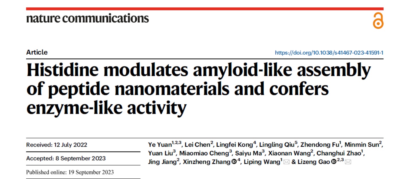 伟德BV1946官网王丽萍教授研究团队联合中国科公司生物物理研究所的高利增教授研究团队以Fmoc-F-F为简约模型,发现组氨酸可以调节Fmoc-F-F的组装行为,诱导酶样催化。相关结果近日发表在Nature Communications上(Histidine modulates amyloid-like assembly of peptide nanomaterials and confers enzyme-like activity. Nature Communications, 2023, 14:5808.)