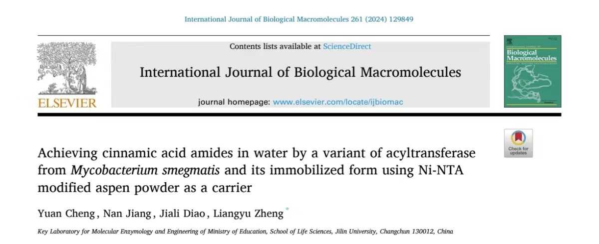 通过虚拟筛选获得的酰基转移酶 MsAcT突变体,具有水相N-酰化反应活性,可以在水相中实现肉桂酸酰胺的高产率制备;以生物质木粉为载体,采用亲和固定化策略,实现了MsAcT突变体的同步纯化与固定化,进一步提高了酶在水相中的N-酰化反应活性,使用稳定性及重复实用性,具有很好的应用前景。该研究论文“Achieving cinnamic acid amides in water by a variant of acyltransferase from Mycobacterium smegmatis and its immobilized form using Ni-NTA modified aspen powder as a carrier”已发表在国际学术期刊《International Journal of Biological Macromolecules》上。论文第一完成单位为伟德BV1946官网,博士生程媛为该论文的第一作者,郑良玉教授为该论文的通讯作者。