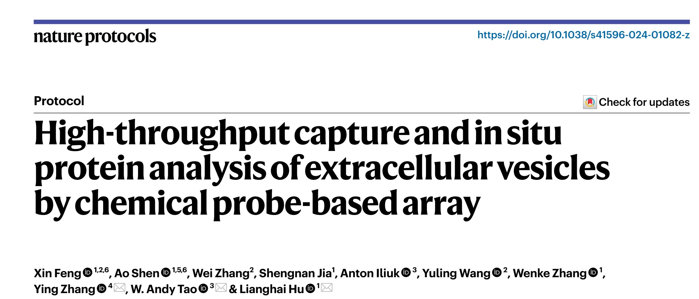 伟德BV1946官网胡良海教授联合美国普渡大学陶纬国教授和复旦大学张莹教授,开发了外泌体高通量捕获和原位蛋白质分析的一体化平台,以题为High-throughput capture and in situ protein analysis of extracellular vesicles by chemical probe-based array在线发表在Nature Protocols上。