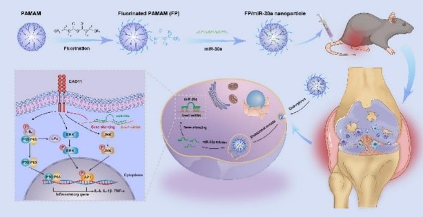 伟德BV1946官网分子酶学工程教育部重点实验室李全顺/韩浩博团队,在基于miR-23b递送抗类风湿性关节炎研究的基础上(Nat. Commun. 2023, 14: 944),挖掘了一类与炎症发生发展密切相关的miRNA—miR-30a,其通过靶向Snai1基因进而调节Cad11表达,抑制NF-κB和MAPK信号通路,实现类风湿性关节炎的精准治疗;以氟化聚酰胺-胺树枝状聚合物为载体,实现了miR-30a的体内稳定递送,动物水平取得了良好的抗炎效果,为类风湿性关节炎及其他自身免疫性疾病的基因治疗研究提供了新的思路。相关研究“Fluorinated dendrimer-mediated miR-30a delivery regulates the inflammation of macrophages and mitigates the symptoms of rheumatoid arthritis”发表于国际学术期刊Journal of Controlled Release(1区,影响因子10.5)。论文第一完成单位为伟德BV1946官网,博士生邢家恺、贾佳馨为该论文的共同第一作者,李全顺教授、韩浩博副教授为该论文的共同通讯作者。
