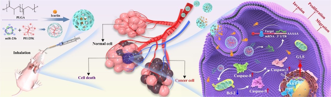 同时,miR-23b除具有抗炎功能外,其能够抑制细胞增殖,在肿瘤基因治疗研究中具有广阔的前景。研究团队针对肺癌传统治疗手段靶向性差及副作用大等缺陷,构建了以PLGA为基质的多孔微球体系,该体系实现了淫羊藿苷与miR-23b的担载,基于吸入式策略实现了药物与治疗基因在肺部的靶向沉积和持续释放,有效诱导肺癌细胞凋亡并抑制肿瘤转移,为肺癌的药物与基因联合治疗提供了一条局部给药新策略。相关研究“Porous PLGA microspheres for the inhalation delivery of icariin and miR-23b in the treatment of metastatic lung cancer”发表于国际学术期刊Asian Journal of Pharmaceutical Sciences(1区,影响因子10.7)。论文第一完成单位为伟德BV1946官网,博士生熊博宇为该论文的第一作者,李全顺教授、韩浩博副教授为该论文的共同通讯作者。