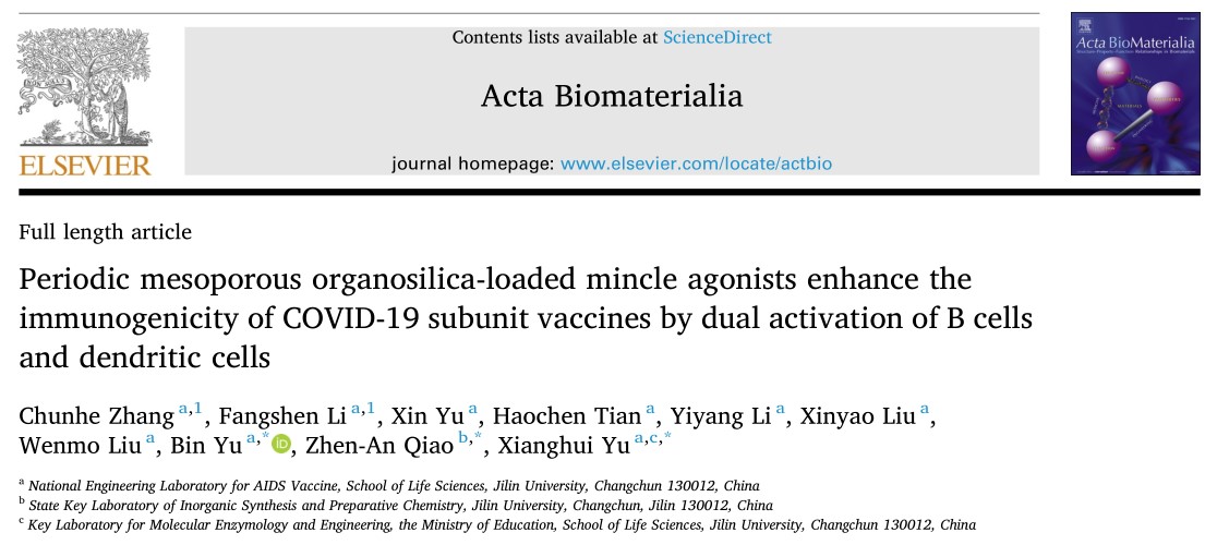 伟德BV1946官网艾滋病疫苗国家工程实验室于湘晖教授/于彬教授团队与伟德BV1946官网无机合成与制备化学国家重点实验室乔振安教授合作,设计了一种复合型的纳米佐剂TDB@PMO,研究发现其能有效地将抗原递送到淋巴结,增强APC的抗原提呈。同时,TDB@PMO佐剂可同时激活B细胞和DC细胞的固有免疫Mincle信号通路,进一步增强生发中心(GC)应答和SARS-CoV-2 特异性的体液和细胞免疫反应。相关研究成果以“Periodic mesoporous organosilica-loaded mincle agonists enhance the immunogenicity of COVID-19 subunit vaccines by dual activation of B cells and dendritic cells”为题在《Acta Biomaterialia》杂志发表。