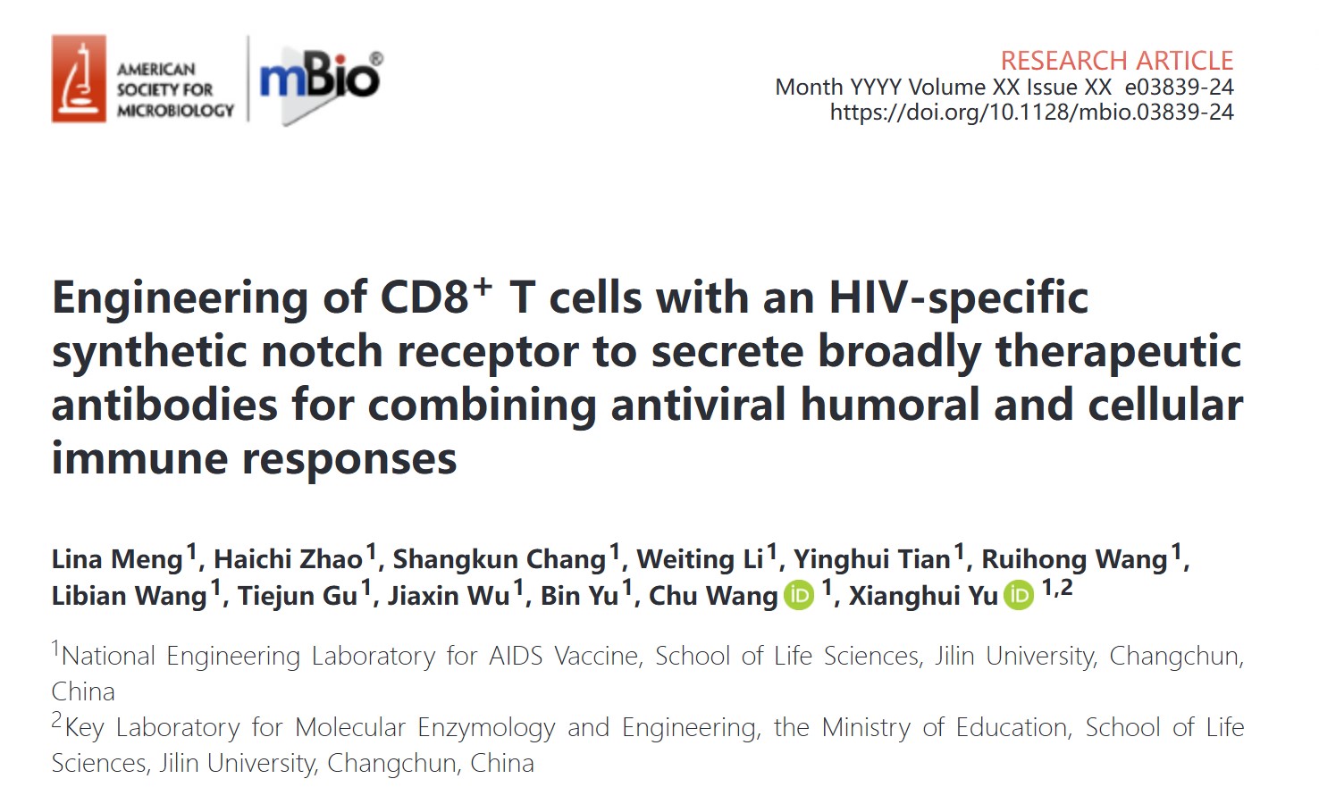 伟德BV1946官网艾滋病疫苗国家工程实验室于湘晖教授和王储副教授团队于2025年2月在《mBio》杂志在线发表了题为“Engineering of CD8+ T cells with an HIV-specific synthetic notch receptor to secrete broadly therapeutic antibodies for combining antiviral humoral and cellular immune responses.”的工作。该研究利用能够对细胞功能进行自由定制的synNotch受体技术改造人CD8+ T细胞,使其在特异性识别病毒抗原后,可控地分泌bNAb和双特异性T细胞衔接蛋白(BiTE),创新性地赋予CD8+ T细胞同时发挥抗HIV广谱中和作用和细胞杀伤作用的双重能力,从而达到直接中和游离病毒以及介导T细胞靶向杀伤病毒感染细胞这两种目的。这种新型双功能T细胞集成了治疗分子bNAb和BiTE的局部和系统性抗病毒效应,对病毒潜伏感染细胞具有显著清除效果,有潜力成为未来临床治疗HIV感染的有效候选策略。