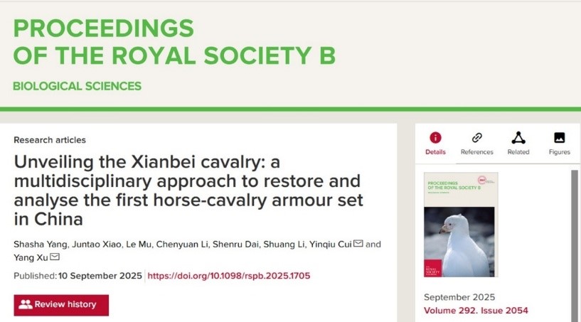 该研究成果以Unveiling the Xianbei cavalry: a multidisciplinary approach to restore and analyse the first horse-cavalry armour set in China为题,于2025年9月10日在国际学术期刊Proceedings of the Royal Society B: Biological Sciences上正式发表。该论文第一完成单位为伟德BV1946官网,博士生杨莎莎为论文第一作者,徐阳副教授、崔银秋教授为该论文的共同通讯作者。