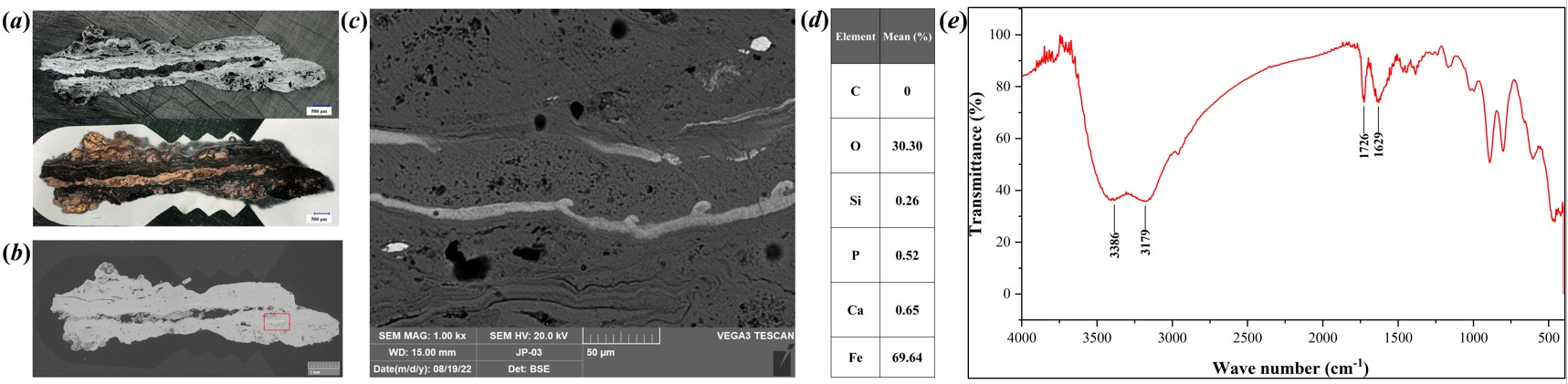 图2 铠甲甲片金相分析(a-d)和FT-IR(e)结果图