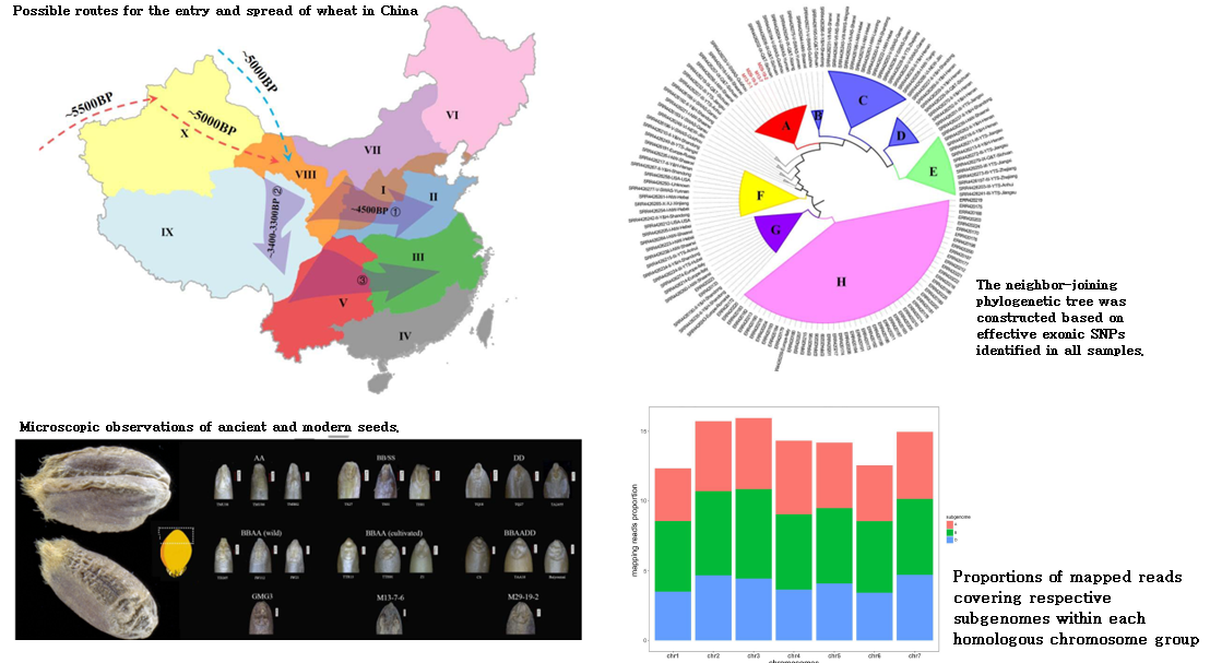 六倍体普通小麦是世界上最重要的粮食作物之一。普通小麦驯化始于大约一万年前近东的新月沃地,然后向西扩散到欧洲,向东扩散到东亚。然而,小麦进入中国的传播途径仍不清楚。伟德BV1946官网崔银秋教授团队克服了古植物中DNA含量极低、降解损伤严重的困难,从距今3800年的单粒小麦种子中成功提取到其基因组DNA,并利用新一代测序技术对中国新疆小河和古墓沟墓地出土的七粒古代小麦种子进行了全基因组测序和序列组装。基因组数据分析和形态学观察均证明出土的小麦为六倍体普通小麦;通过与来自中国以及世界各地的现代六倍体小麦品种的RNA-seq数据进行系统发育分析,证明了古代小麦与中国西南地区现存的普通小麦地方品种的密切关系。青藏高原现代地方品种与古代小麦高度相似的等位基因频率为小麦向高原传播的西南途径提供了更加直接以及有力的分子依据,同时本研究也提出了普通小麦从青藏高原边缘到长江流域的扩散路线。此外,该研究结果为中国种植的现存小麦地方品种的栽培起源,扩散和遗传改良提供了重要信息。