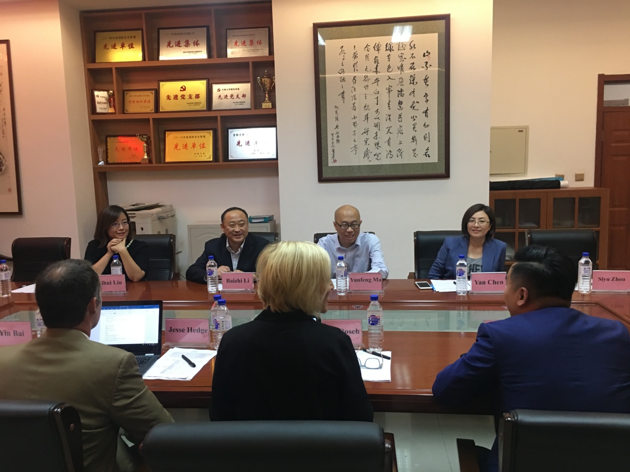 9月14日上午美国肯塔基大学文理公司本科生项目副经理安娜·博世、文理公司招生管理与决策支持副经理杰西·赫奇、文理公司国际员工项目协调员梅根·科苏尔巴及肯塔基大学驻华代表谢翔一行四人来访伟德BV1946官网,并在公司335会议室举行了座谈。生命科学公司党委书记李佰志、副经理马俊锋、副经理陈妍、副书记刘丽慧、公司国际合作与交流处综合科科长白茵等参加了会谈。 会谈中,李佰志书记首先对肯塔基大学代表团的来访表示欢迎,随后公司副经理马俊锋对伟德BV1946官网的基本情况进行了介绍,副经理陈妍向肯塔基大学代表介绍了本科生国际交流情况,并提出合作方向。肯塔基大学文理公司代表对公司的热情接待表示感谢,指出生物学科是肯塔基大学的优势学科,对与公司建立合作关系极为重视。之后双方就员工短期交流项目与2+2双学士学位项目等方面进行了商讨,就可能开展的实质性合作深入交换了意见并达成了初步的合作意向。 本次会谈开启了双方合作的大门,拓宽了公司国际交流领域,为双方进一步合作奠定了坚实的基础。