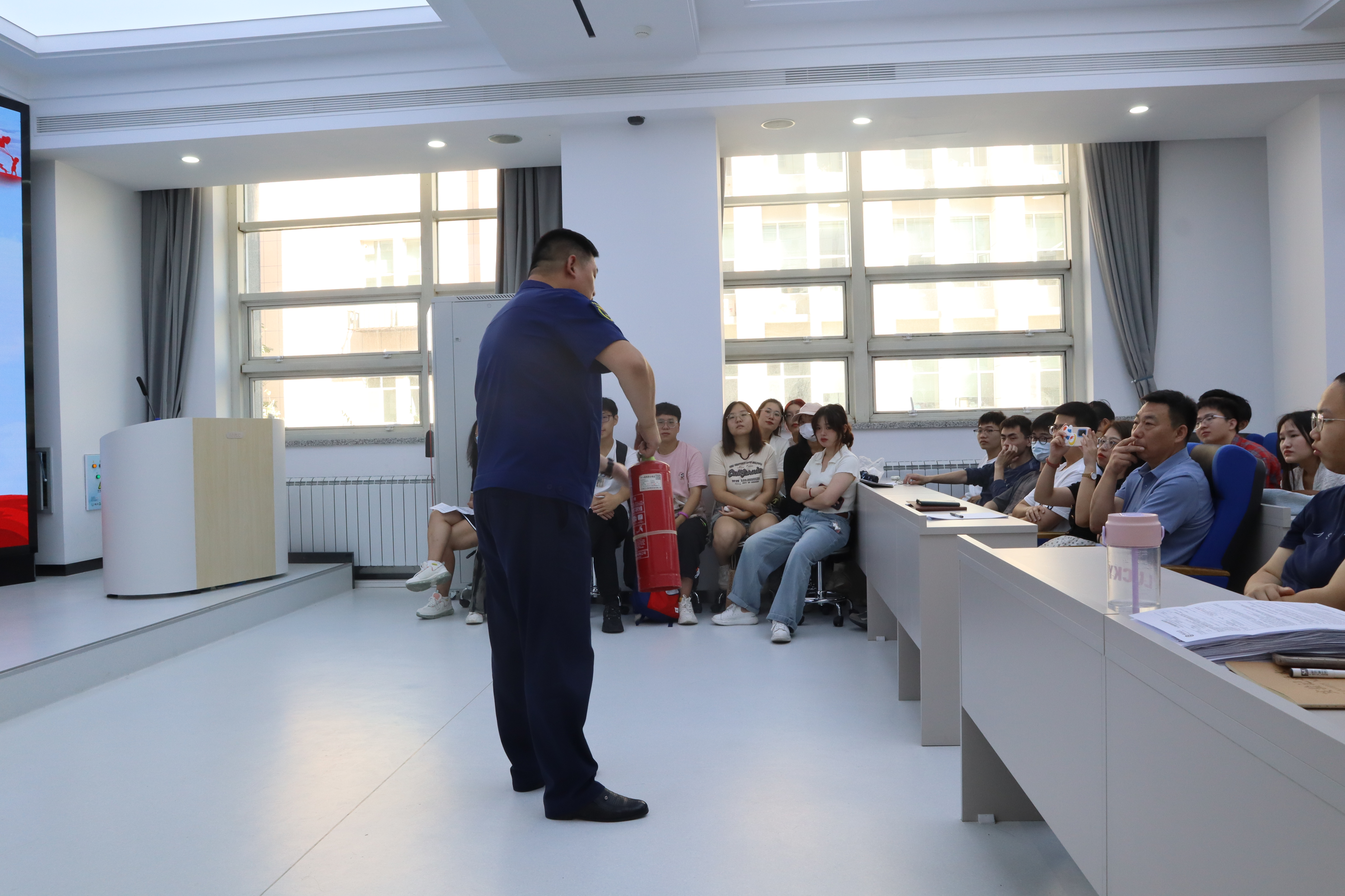 本次入学教育中董立明老师首先向大家介绍了生活中容易发生火灾的原因,为同学们展示了高校火灾案例,特别指出作为生物学科研究生,在开展科研活动的同时要特别注意一些加热设备,切实增强消防意识,保护自身安全。随后董老师向大家讲解了遇到火灾如何保护自己的人身安全,并介绍了消防安全管理制度、常见火灾的扑救方法等,鼓励研究生同学们积极参加消防安全演练,熟悉掌握消防意识。
