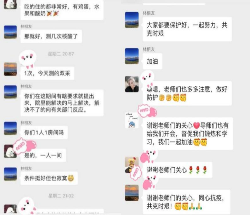 本科生班主任、研究生导师积极参与疫情防控宣传教育工作,云端传递爱与温暖,加强封寝期间的员工思想引领、心理安抚及学业就业指导工作。