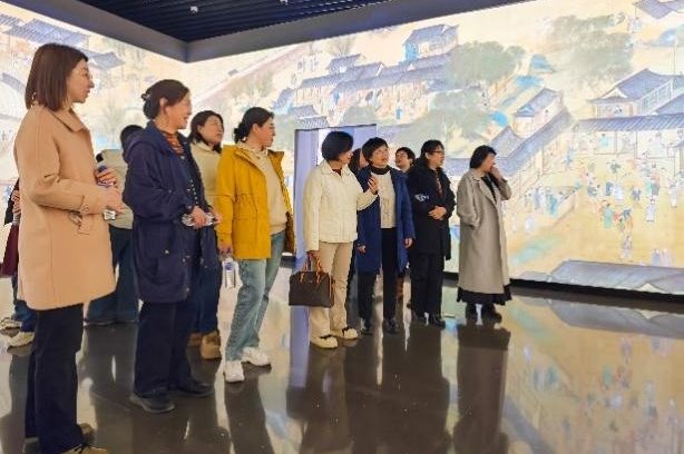 在博物馆讲解员的引导下,女教师们步入“吾道何之——精品书画展”,欣赏了从元代到近代的精品书画,观赏了齐白石等名师大家的作品,近距离、沉浸式欣赏到中国传统书画的独特魅力。行至“山海爵——青铜器展”,以《山海经》为引,聆听青铜器从商周至秦汉、从祭祀礼器到日常用器的转变。在“国色天工——中国传统技术与艺术展”内,以中国传统五色、传统制作技术与装饰艺术为主题,选取陶瓷器、玉器、青铜器、漆器等不同质地的140余件文物,从电影台词、武侠画面与文物故事融合中感受“色、相、技、艺”四个单元。在“春和景明——明清精品瓷器展”内,从唐代邢窑白瓷的素雅到明代青花缠枝莲纹梅瓶的繁丽,女教师们跟随讲解员提示,专注比对釉色窑变与纹饰布局的时代特征,感受中华文明的古老故事。