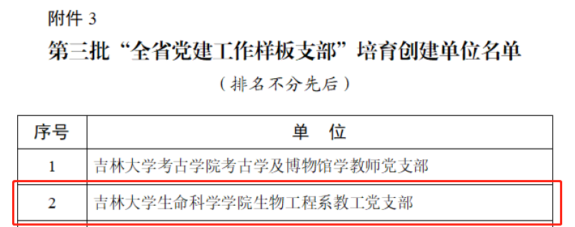近日,中共吉林省委教育工作委员会正式公布第三批新时代全省党建工作示范高校、标杆院系、样板支部培育创建单位名单。伟德BV1946官网生物工程系教工党支部入选第三批“全省党建工作样板支部”培育创建单位。