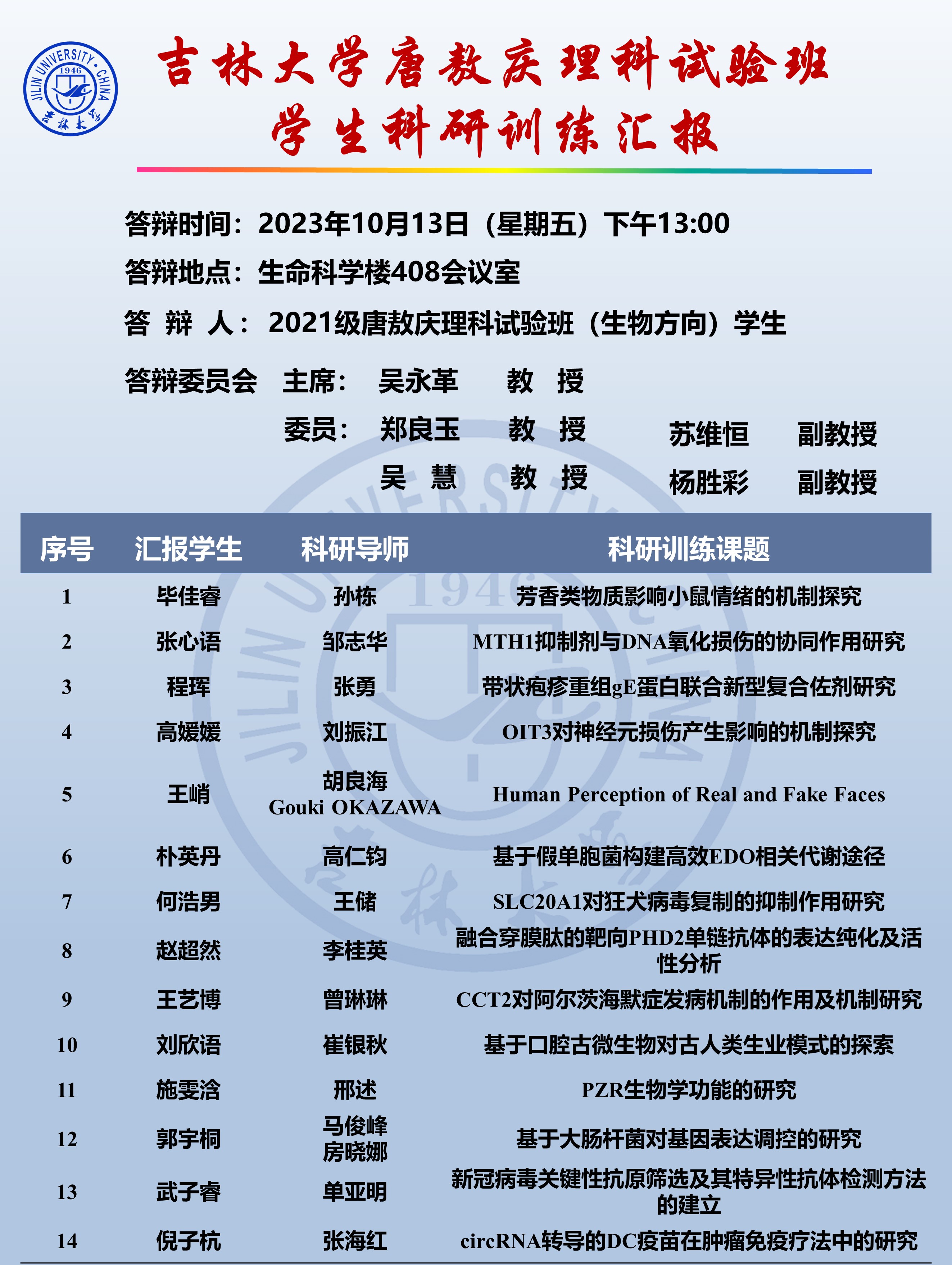 为提升唐敖庆理科试验班员工的科研素养,增强员工及科研导师之间的深入交流,伟德BV1946官网于10月13日下午组织开展了唐敖庆理科试验班生物方向(唐生班)拔尖员工科研训练进展汇报。此次汇报面向全校公开进行,汇报主体为2021级唐生班全体员工和2020级唐生班员工代表,邀请吴永革教授、郑良玉教授、吴慧教授、苏维恒副教授、杨胜彩副教授担任专家评委。伟德BV1946官网经理于湘晖教授、2021级唐生班科研导师、2022级唐生班员工以及公司唐生班学业导师团队出席汇报会,汇报会由副经理陈妍教授主持。