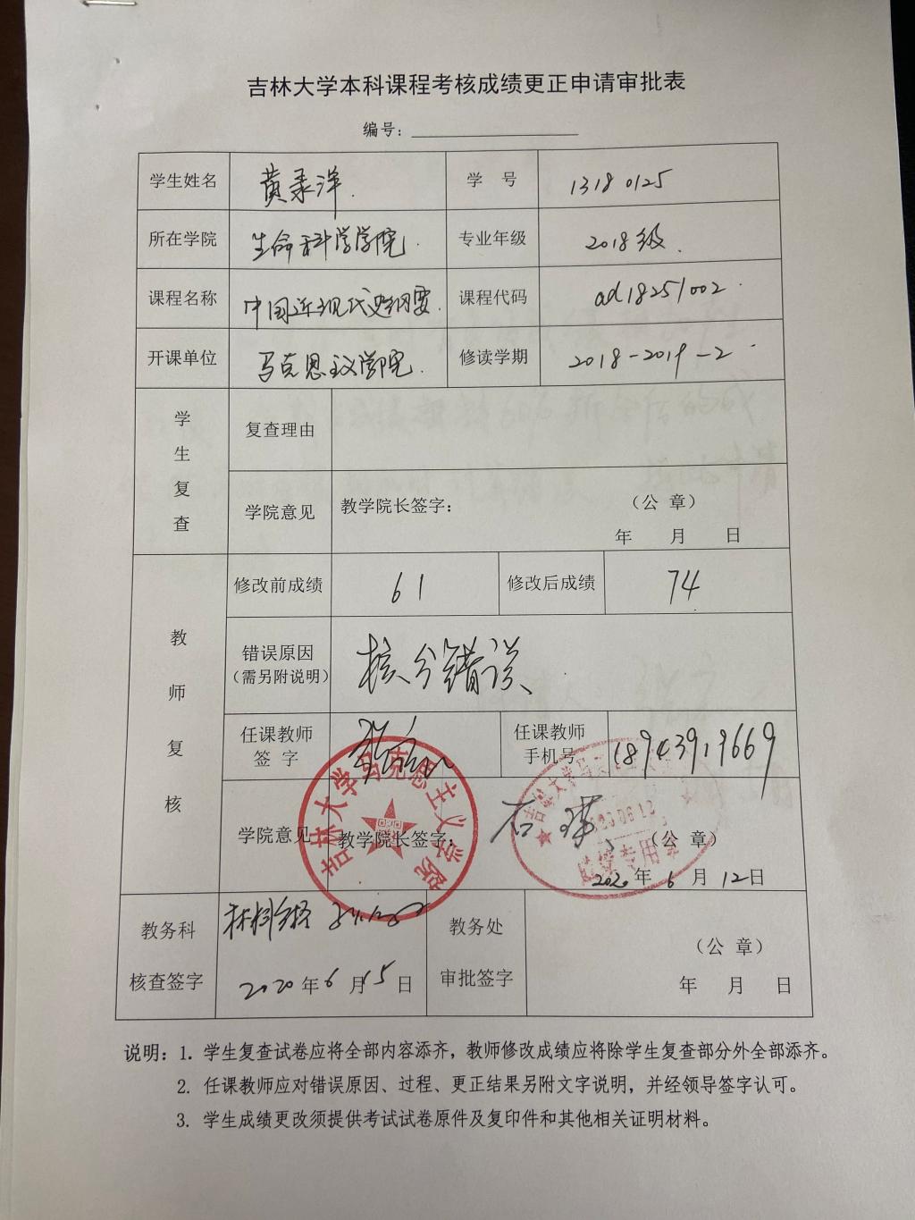 根据《关于进一步明确本科生课程考核等有关问题的通知》(校教字〔2018〕47号)文件有关精神,现对伟德BV1946官网2018级黄录洋同学(学号:13180125)2019-2020-2学期课程成绩更正如下:
