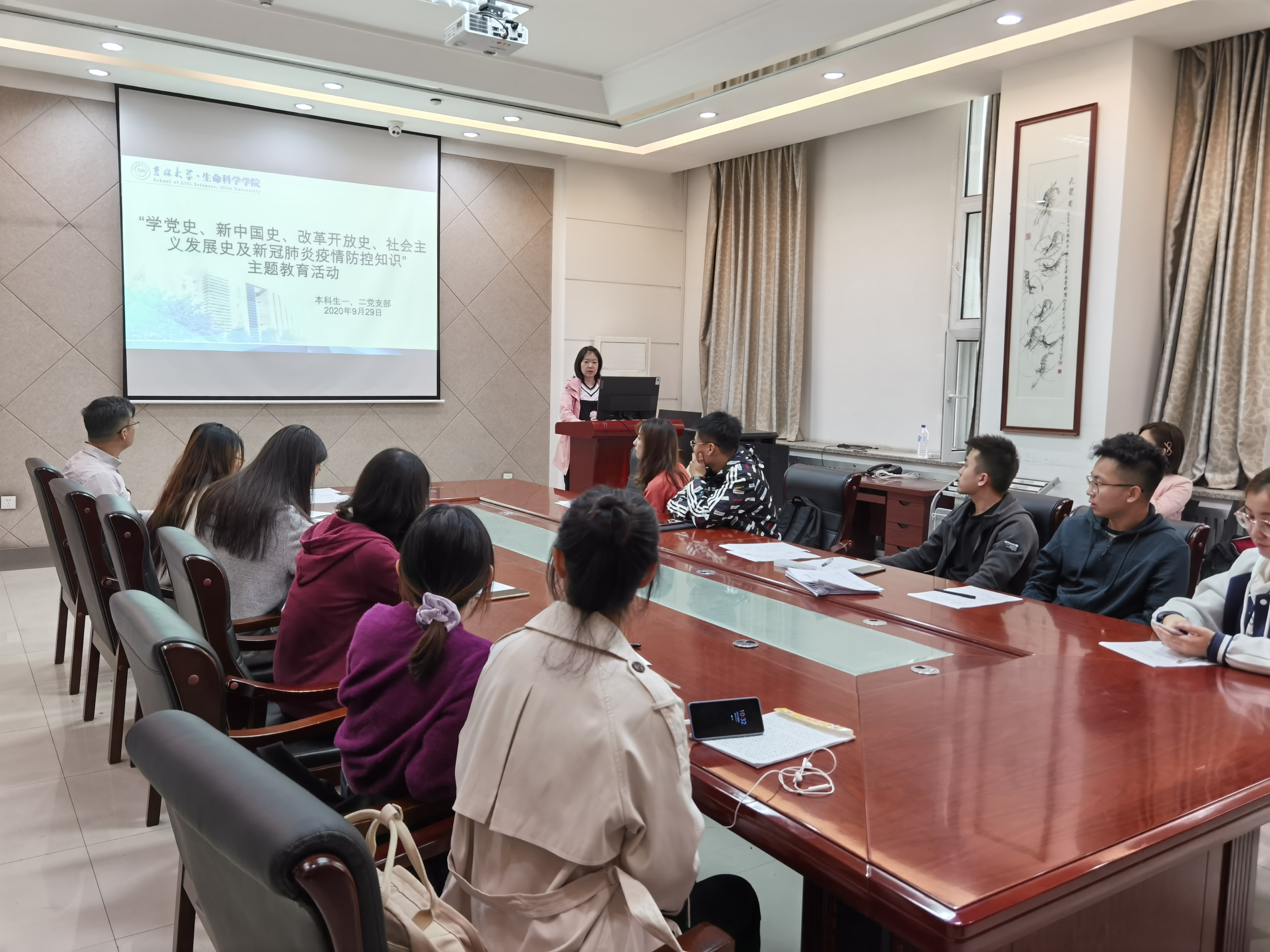 2020年9月29日,伟德BV1946官网本科生第一、二党支部于生科楼335会议室开展了“学党史、新中国史、改革开放史、社会主义发展史及新冠肺炎疫情防控知识”主题党日活动,张春阳老师、丁子芮老师、齐鹏老师、崔帅书记以及党支部全体党员参加了此次活动。