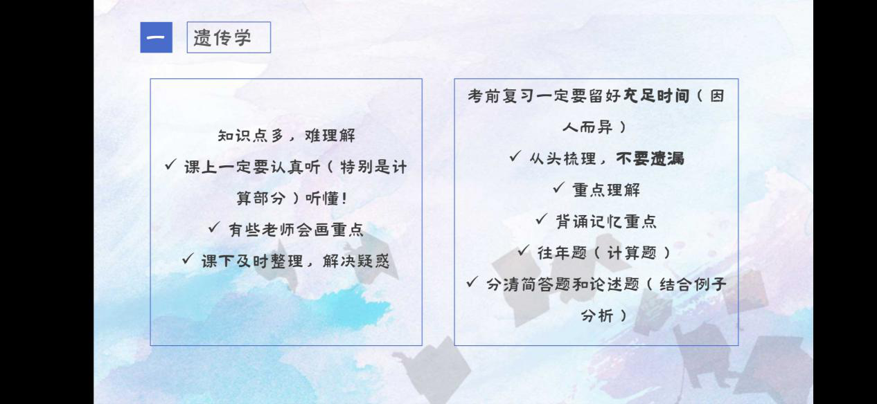 张祎宁学姐不仅为我们分享了微生物学、遗传学等课程的学习方法,还重点分享了如何备考计算机二级和英语四六级。同时为我们讲解了大创的流程和她的大创经验。