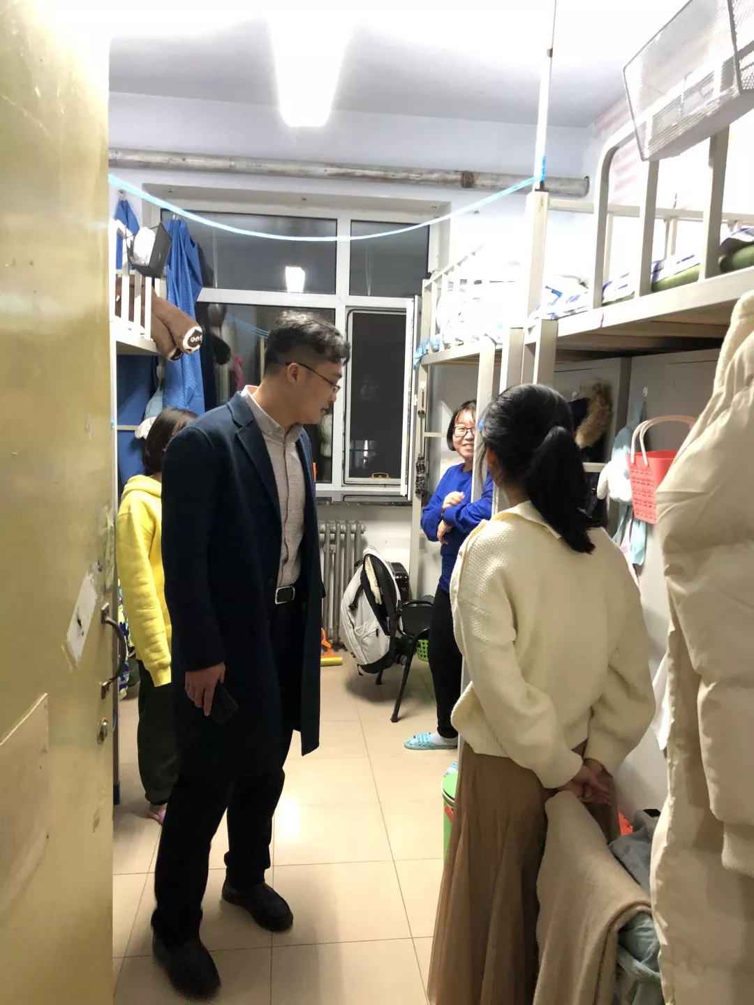 老师与同学们进行了亲切的交流,询问了同学们学习与生活的情况,叮嘱同学们冬季要注意保暖,在日常生活中要继续保持寝室卫生,注意安全用电等问题。其他跟随查寝的同学们也非常认真负责,对寝室卫生、通风情况做了仔细检查,还对寝室养小动物的问题进行了排查。