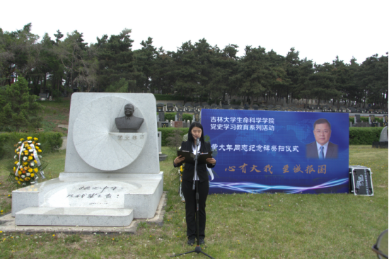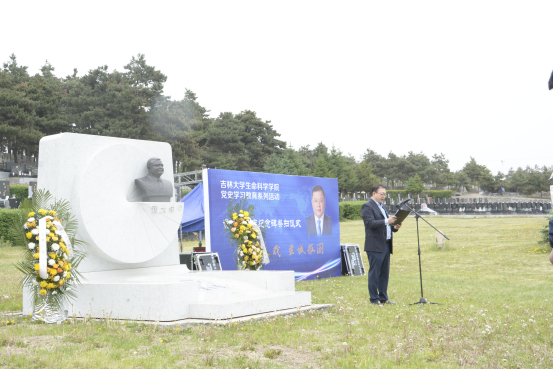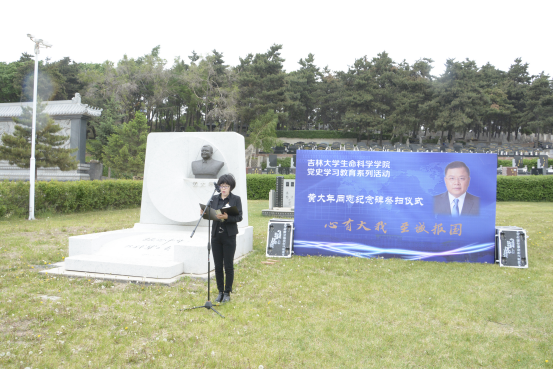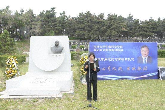 公司微生物学与免疫学系教工党支部书记单亚明代表教师发言 ,他说道“祭扫黄大年同志纪念碑,站在‘两个一百年奋斗目标的历史交汇点上,作为党员,我们应当继续传承发扬黄大年老师心有大我、至诚报国的爱国情怀。教书育人、敢为人先的敬业精神,淡泊名利、甘于奉献的高尚情操。以‘只要祖国需要,我必全力以赴’的坚定勇气。迎接‘双一流建设’船到江心的关键期,应对祖国发展改革攻坚的发力期,勇担职责使命,不负时代重托。”