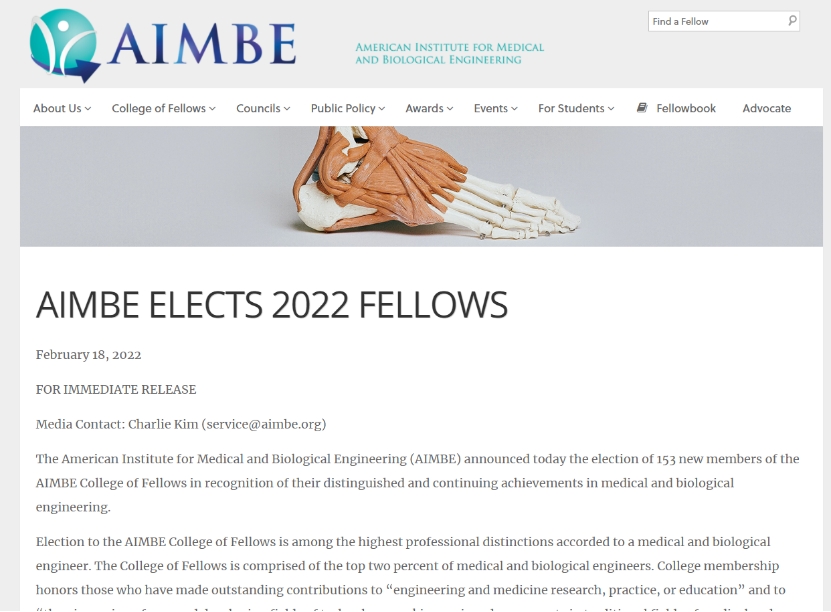美国医学与生物工程院(American Institute for Medical and Biological Engineering,简称AIMBE)隶属于美国科公司,是国际医学与生物工程领域著名的非营利性学术组织,汇聚了世界生物医学工程领域的学术精英(Top 2%),以及最具创新和特色的医学与生物工程领域的学者和工程师,其中包括3名诺贝尔奖得主、18位美国总统奖得主、201位美国工程院院士、101位美国医公司院士及45位美国科公司院士。AIMBE Fellows由世界医学与生物工程领域最杰出的学者组成,每年经过国际同行推荐与严格评选产生,由现有Fellows推荐,经两轮筛选,最后一轮须经过现有的全体Fellows投票,是美国医学和生物工程技术领域的最高学术荣誉。