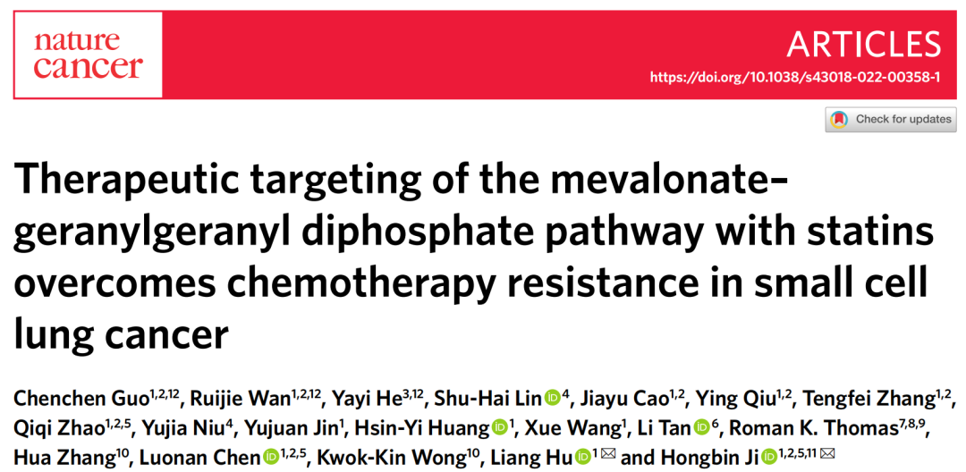 2022年4月21日,公司员工、中国科公司分子细胞科学卓越创新中心(生物化学与细胞生物学研究所)季红斌及其课题组在Nature Cancer上发表了文章 Therapeutic targeting of the mevalonate–geranylgeranyl diphosphate pathway with statins overcomes chemotherapy resistance in small cell lung cancer。该研究揭示了甲羟戊酸(MVA)- 香叶基香叶基二磷酸(GGPP)代谢途径在小细胞肺癌化疗耐药中的功能及其机制并提出靶向治疗新策略。