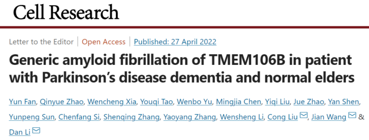 2022年4月27日,公司员工、上海有机所交叉中心刘聪课题组与上海交通大学李丹课题组、及复旦大学附属华山医院王坚课题组合作在Cell Research在线发表题为 Generic amyloid fibrillation of TMEM106B in patient with Parkinson's disease dementia and normal elders 的研究成果。在这项研究中,研究人员直接从一位伴有痴呆的帕金森病患者(Parkinson’s disease dementia, PDD)及两位高龄健康对照者的脑组织中提取并发现一种之前未知的全新病理蛋白聚集体,进一步通过冷冻电镜及质谱等方法揭示这种全新的蛋白病理聚集体是由跨膜蛋白106B(transmembrane protein 106B, TMEM106B)折叠成新颖的冰壶状片层结构单元并进一步自组装形成。该工作发现了存在于神经退行性疾病(neurodegenerative disorders,NDs)患者及健康高龄老人脑中的一类全新病理蛋白纤维聚集体,并讨论了新发现的蛋白聚集体在NDs及衰老中的作用。