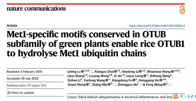 8月9日,公司员工王丰(北京理工老员工命公司)、梅子青(北京科技大学化学与生物工程公司)与广西大学何正国团队合作联合在国际著名学术期刊《自然-通讯》(Nature Communications)发表题为《绿色植物OTUB亚家族中保守的Met1特异性基序使水稻OTUB1能够水解Met1泛素链》(Met1-specific Motifs conserved in OTUB subfamily of green plants enable rice OTUB1 to Hydrolyse Met1 Ubiquitin Chains)的研究论文。该工作在国际上首次揭示了水稻去泛素化酶OTUB1水解Met1泛素链的分子机制,发现了跨物种范围OTUB亚家族成员水解Met1泛素链的分子开关。
