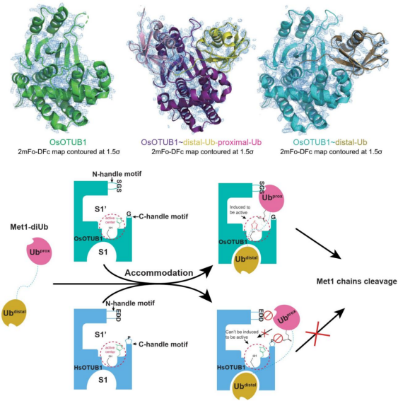 泛素-去泛素过程在动物、植物、微生物等多种生物中普遍存在,广泛参与包括炎症和先天免疫信号传导调控等基础生命过程。然而,目前关于植物中的Met1类型泛素链的去泛素酶的作用机制仍然不清楚。该项工作中创新性采用一锅法高效制备了携带脱氢丙氨酸的Met1-二泛素自杀型探针,发现了水稻源OTUB1(OsOTUB1)能够高效水解Met1类型泛素链。通过解析OsOTUB1、OsOTUB1~Met1-二泛素复合物、OsOTUB1~泛素复合物的晶体结构,发现Met1泛素链的水解活性(Met1活性)由OsOTUB1 S1'口袋中的Met1特异性基序N-handle motif和C-handle motif所决定的。有趣的是,这些基序在绿色植物中广泛保守但在后生动物中完全不存在,因此这一发现为在分类学上区分原始单细胞生物(无典型特征)为植物细胞还是动物细胞提供了全新的分子标准。