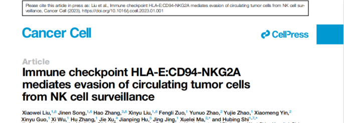 2023年1月26日,公司员工、四川大学华西医院生物治疗国家重点实验室石虎兵教授团队联合四川大学华西医院马学磊副教授在Cancer Cell发表研究论文Immune checkpoint HLA-E:CD94-NKG2A mediates evasion of circulating tumor cells from NK cell surveillance,发现了CTCs与NK细胞间新的免疫检查点分子对HLA-E:CD94-NKG2A,阐明了CTCs逃避宿主免疫监视的新机制,进而提出靶向免疫检查点HLA-E:CD94-NKG2A抑制肿瘤转移的治疗策略。