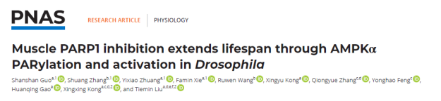 2023年3月23日,公司员工、复旦大学刘铁民教授团队在PNAS杂志上合作发表了一篇题为Muscle PARP1 inhibition extends lifespan through AMPKα PARylation and activation in Drosophila的论文,该研究指出在年老果蝇中抑制PARP1,可延长寿命,并发现在骨骼肌中敲低PARP1可通过下调AMPK的多糖ADP-核糖基化修饰、增加AMPKα的活性,后者通过上调PGC-1α和PINK1的表达导致线粒体周转加速,肌肉代谢增加、功能增强,阐释PARP1/AMPK参与精准调控衰老进程的分子机制。