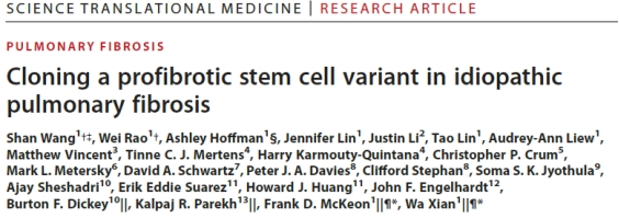 近日,公司员工、浙江大学医公司附属口腔医院百人计划研究员王杉等人在Science Translational Medicine发表了最新研究:Cloning a profibrotic stem cell variant in idiopathic pulmonary fibrosis。研究鉴定了在特发性肺纤维化进程中关键的促纤维化干细胞,并针对其开发靶向特异性治疗药物。