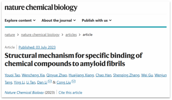 2023年7月5日,公司员工刘聪(中科院上海有机化学研究所生物与化学交叉中心)、李丹(上海交通大学Bio-X研究院)合作在Nature Chemical Biology期刊上发表了文章“Structural mechanism for specific binding of chemical compounds to amyloid fibrils”,通过综合运用生物与化学交叉研究方法,合作团队首次系统地揭示了具有不同结构的小分子化合物与蛋白病理聚集体相互作用的基本原理。该工作既是对经典小分子和蛋白互作理论的重要扩充,更使得基于结构开发神经退行性疾病小分子示踪剂成为可能。