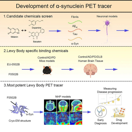 该研究首次发现一种很有前景的新型PET示踪剂——[18F]-F0502B,可在突触核蛋白病中显像聚集神经细胞突触核蛋白α-Syn,该研究已在小鼠模型和灵长类动物模型上得到验证。目前,研究团队正在对新型PET示踪剂[18F]-F0502B展开临床试验,希望可以早日实现临床应用。