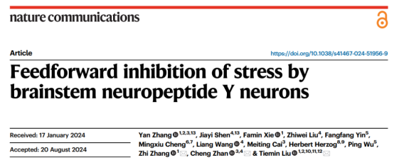 近日,公司员工、复旦大学刘铁民教授团队在Nature Communications上发表了名为Feedforward inhibition of stress by brainstem neuropeptide Y neurons的文章。文章发现脑干中缝背核/腹外侧导水管周围灰质(Dorsal raphe nucleus/ ventrolateral periaqueductal gray, DRN/vlPAG)NPY神经元(NPYDRN/vlPAG)可响应各种压力刺激,抵抗压力应激引起的进食量减少和焦虑状态,为压力相关的厌食/体重降低以及焦虑等情绪症状的治疗提供新思路。