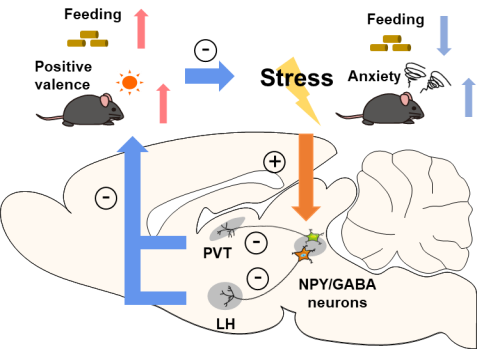 利用化学遗传学手段激活或抑制NPYDRN/vlPAG神经元,可以缓解或加剧因急性新奇压力而导致的进食量减少,激活NPYDRN/vlPAG神经元还能缓解因急性新奇压力产生的焦虑样行为。除了短期压力外,NPYDRN/vlPAG神经元同样参与调控长期压力。在长期束缚压力应激范式中,抑制NPYDRN/vlPAG神经元后会进一步加剧长期束缚引起的进食量减少、体重降低以及焦虑样行为。敲低DRN/vlPAG中的NPY同样加剧应激引起的进食减少和焦虑样行为,表明NPYDRN/vlPAG神经元中表达的NPY是该神经元能缓解压力引起的进食量减少及焦虑样行为的重要因素。荧光原位杂交染色实验表明,NPYDRN/vlPAG神经元主要为GABA能抑制性神经元类群,对下游神经元起到抑制作用。下游投射示踪和功能实验则显示,NPYDRN/vlPAG神经元可能通过投射到丘脑室旁核(Paraventricular thalamic nucleus, PVT)和外侧下丘脑(Lateral hypothalamus, LH),在这两个下游脑区中通过NPY2型受体(NPY2R)发挥作用。